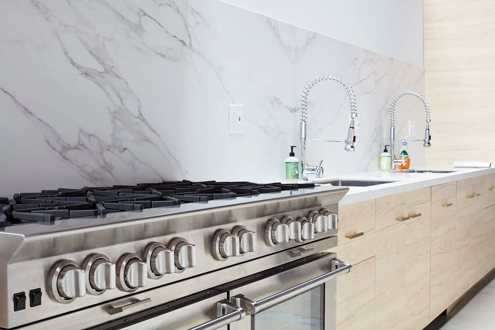 Modern kitchen with light wood cabinetry, marble backsplash, stainless steel stove, island with four wooden stools, and a vase with flowers on the island.