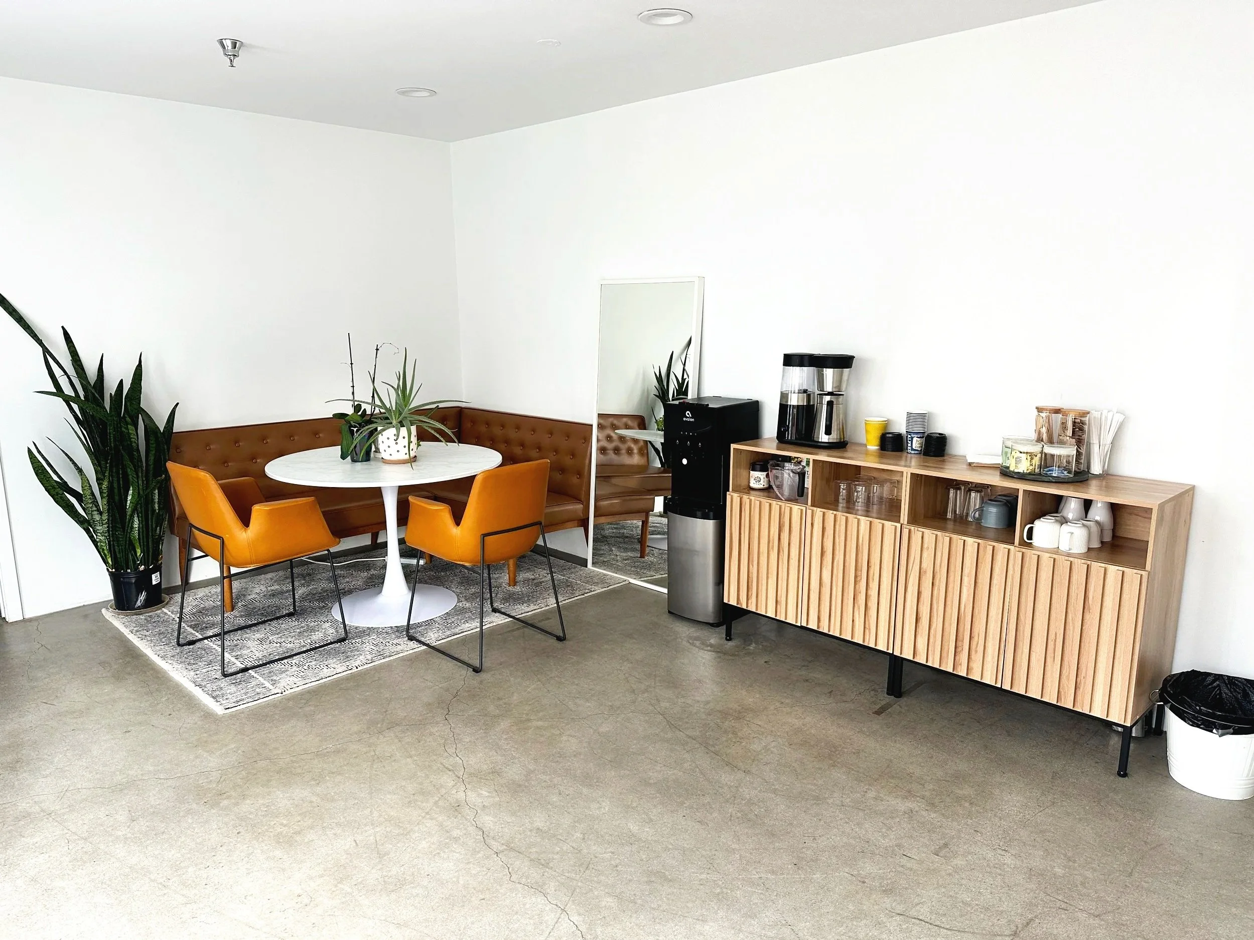 Our light-filled entry with private bathroom doubles as a green room and hair/makeup station for talent— or office for production teams.